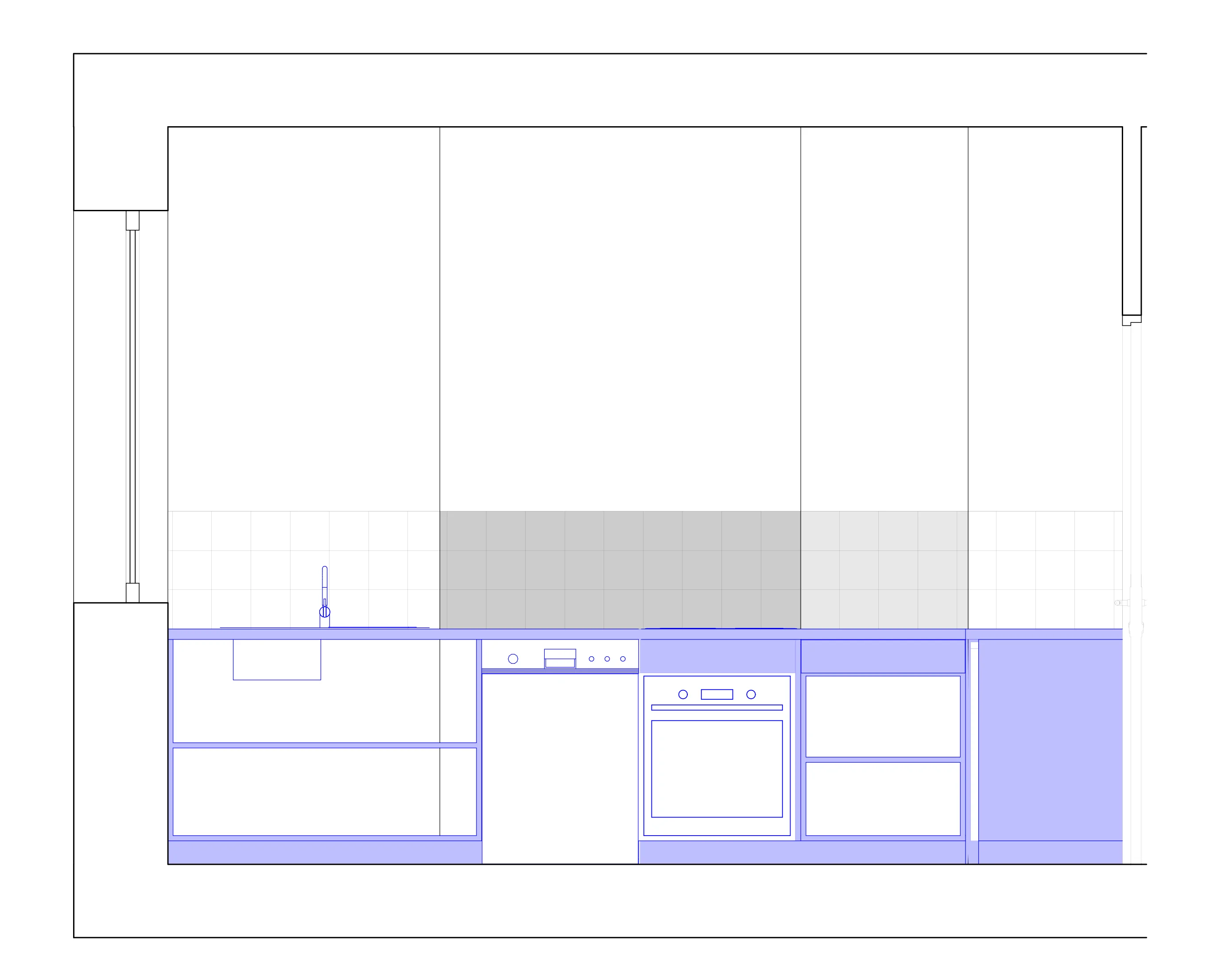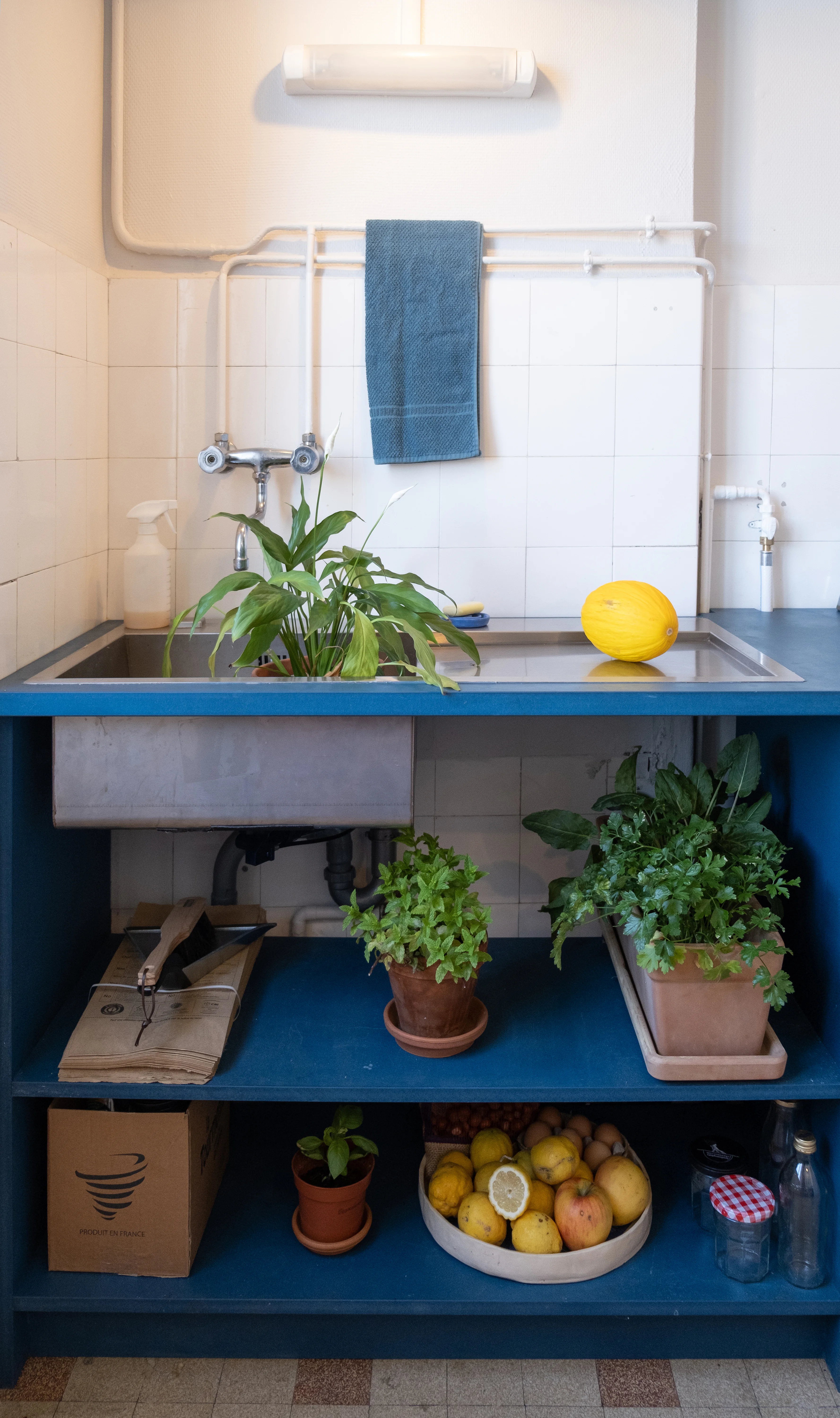 Le parti pris architectural repose sur la simplicité et l'ouverture : pas de portes de placards, pas de meubles hauts qui alourdiraient visuellement l'espace. Les étagères se succèdent en continuité, offrant de généreux plans de travail et des rangements abondants tout en préservant la luminosité.
