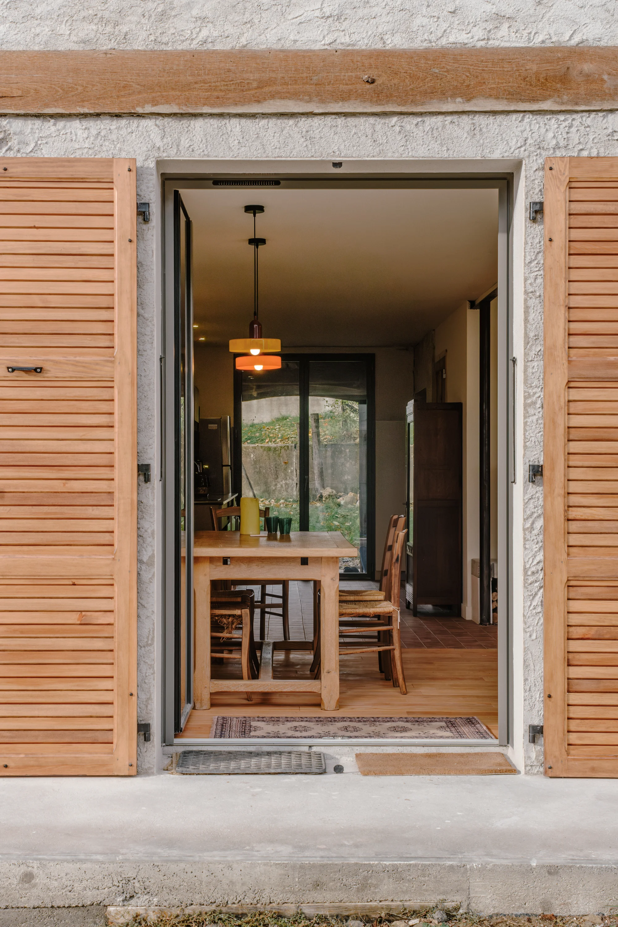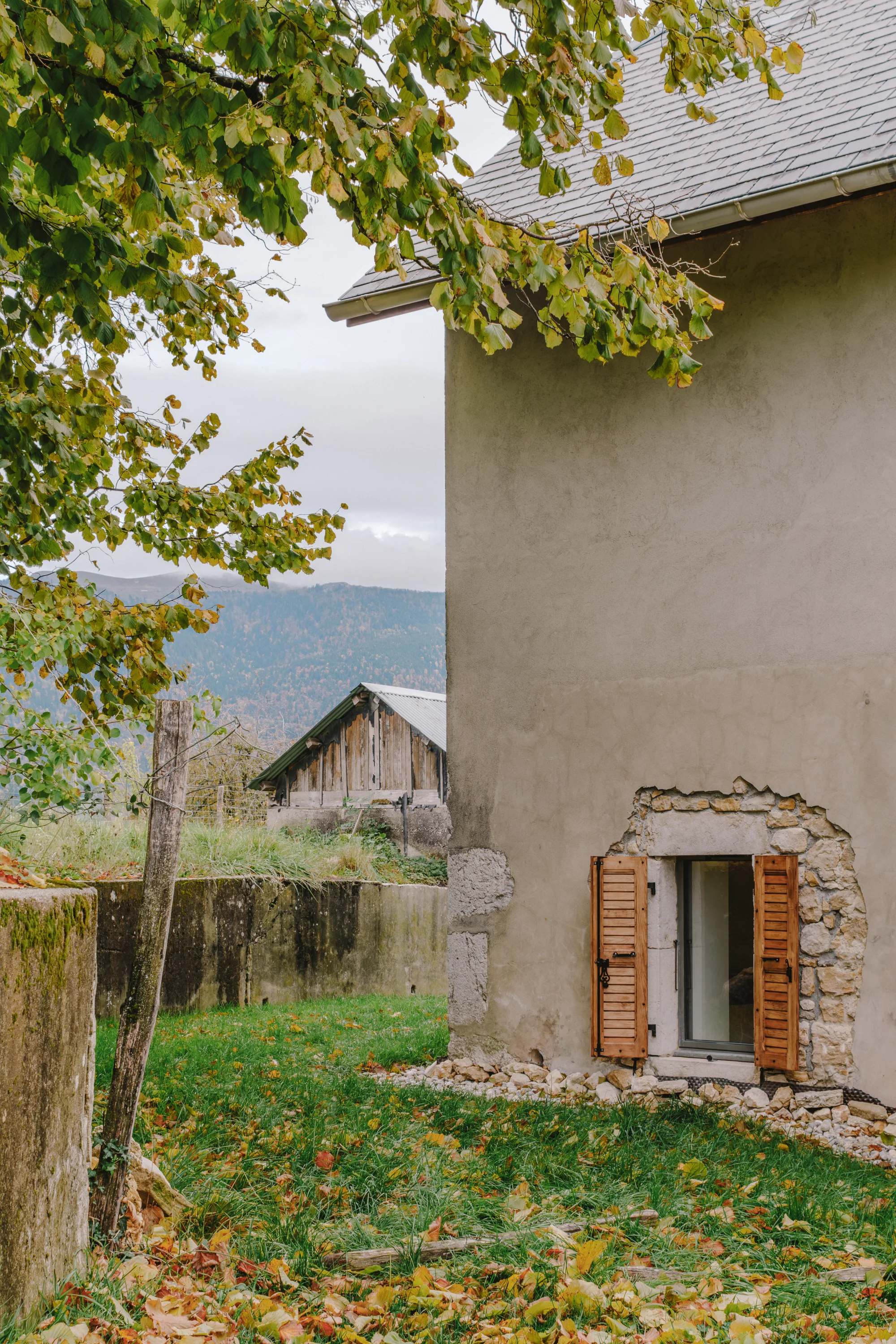 L'ex-atelier, anciennement dédié aux activités agricoles de la ferme, devient un logement indépendant qui s'inscrit en discrétion dans le prolongement de la longère principale. Cette transformation respecte l'échelle du bâti existant et son implantation dans le paysage rural de la vallée du Valromey.