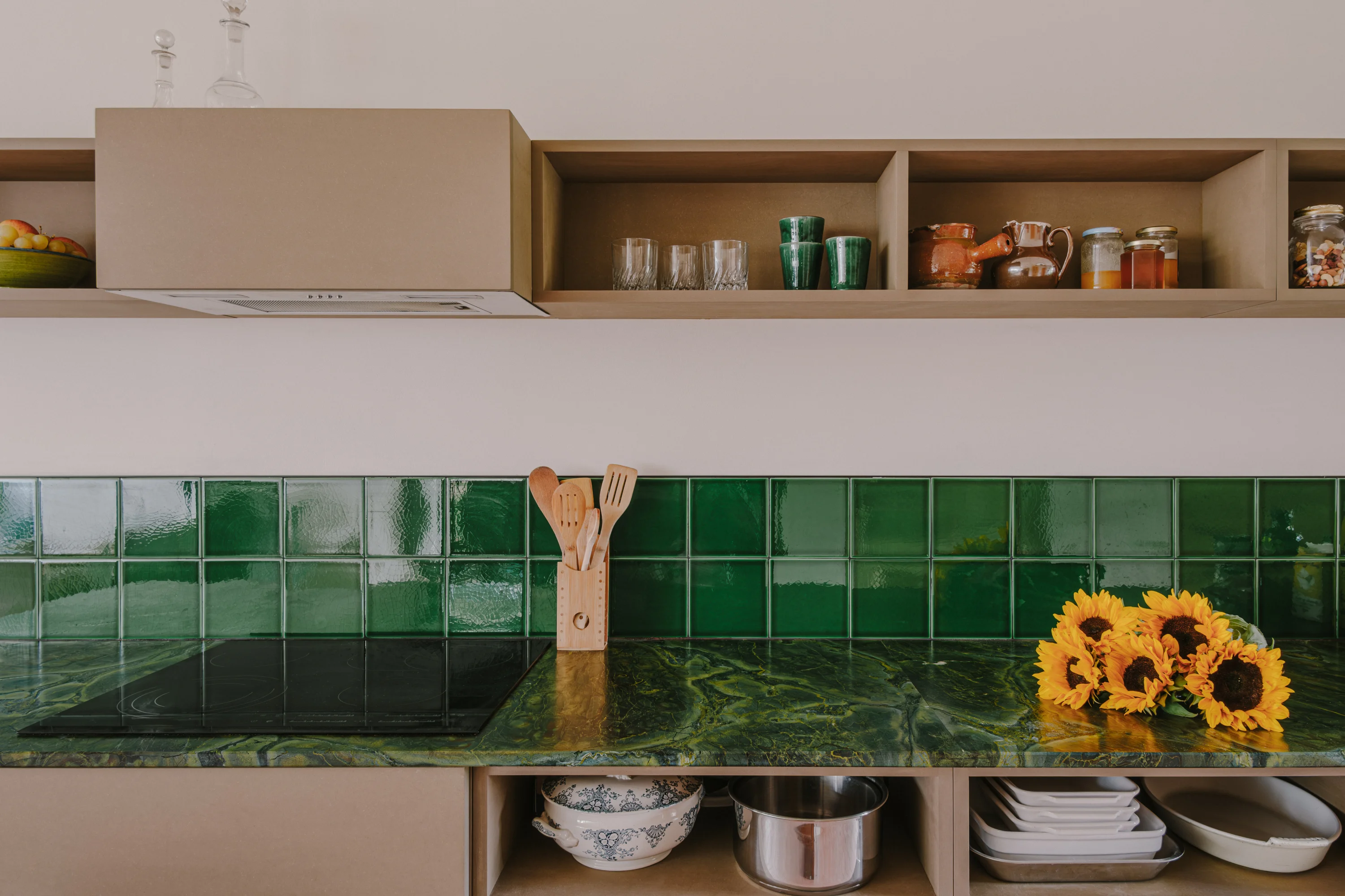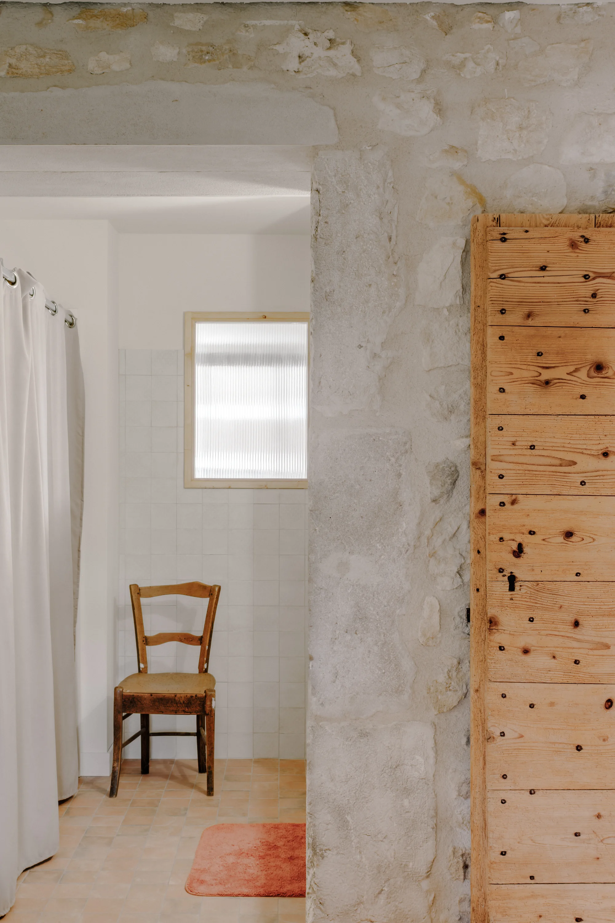 La pierre locale apparente est mise en valeur dans les murs intérieurs et les seuils, créant une texture naturelle et authentique qui rappelle l'origine agricole du lieu. Ces éléments bruts dialoguent avec les aménagements contemporains, créant un équilibre entre mémoire du lieu et usage moderne.