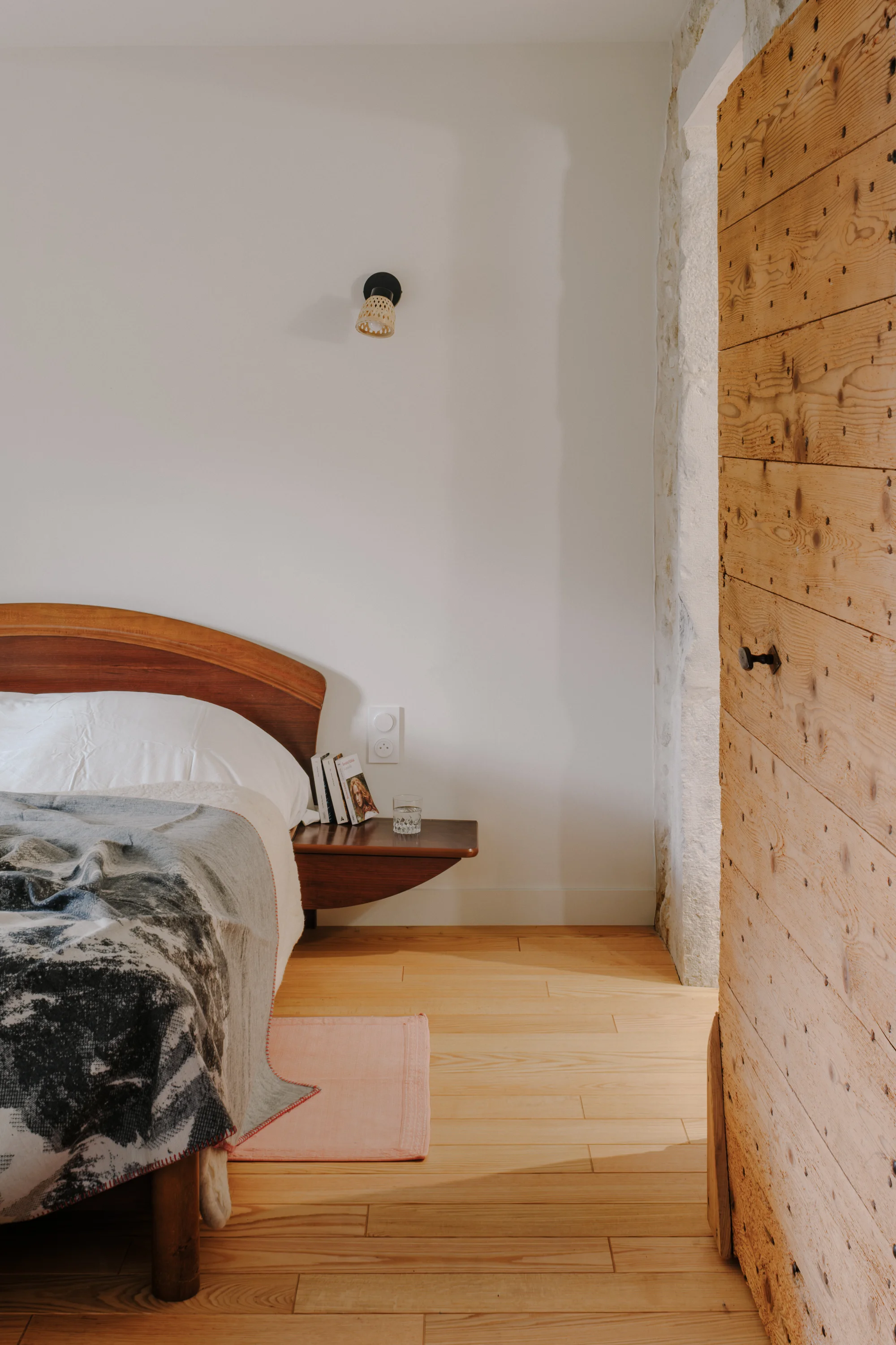 Le projet révèle et met en valeur les éléments patrimoniaux du bâti existant plutôt que de les dissimuler. Les anciennes portes en bois massif ont été soigneusement sablées, restaurées et réemployées dans le projet, conservant leur patine et leur histoire.
